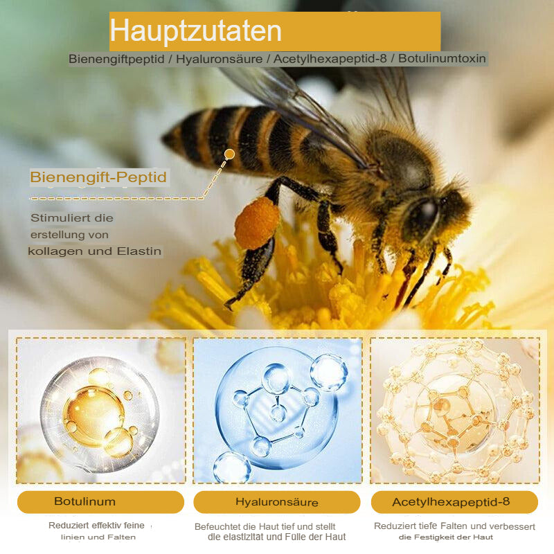 Bienengift-Peptide: Bienengift-Peptide ahmen die natürliche Reaktion der Haut auf Mikrostimulation nach und regen die Produktion von Kollagen und Elastin an. Dadurch kann die Haut sofort straffer und fester wirken, Hautunregelmäßigkeiten werden gemildert und es entsteht ein temporärer Lifting-Effekt.